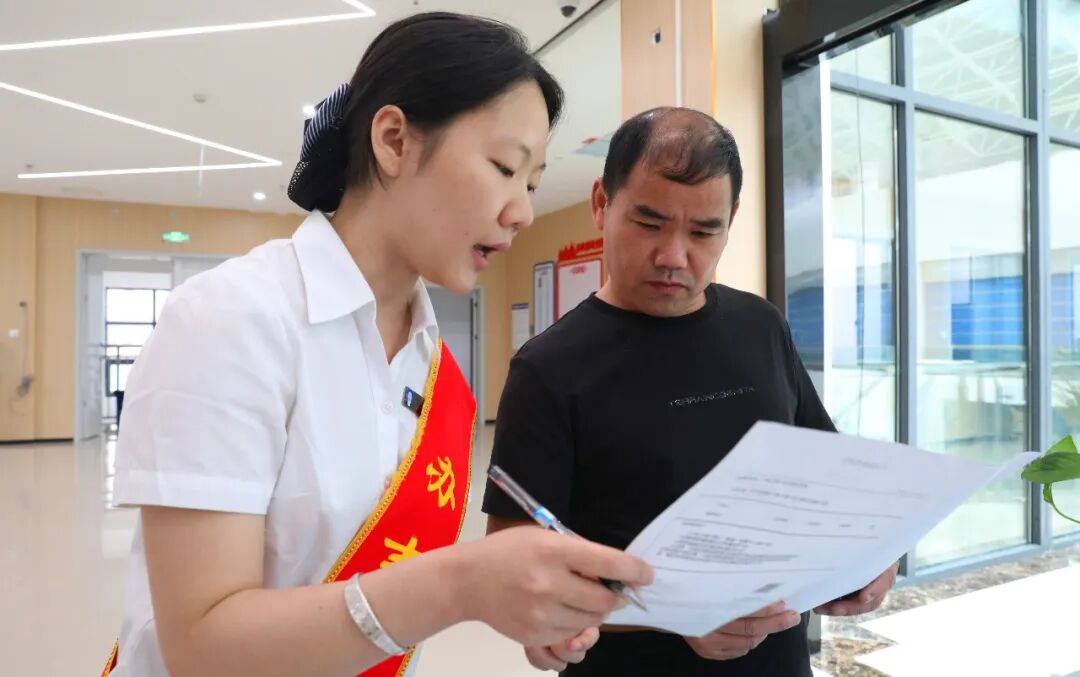 看到有人进来,大厅导办员热情迎上去询问和解答。