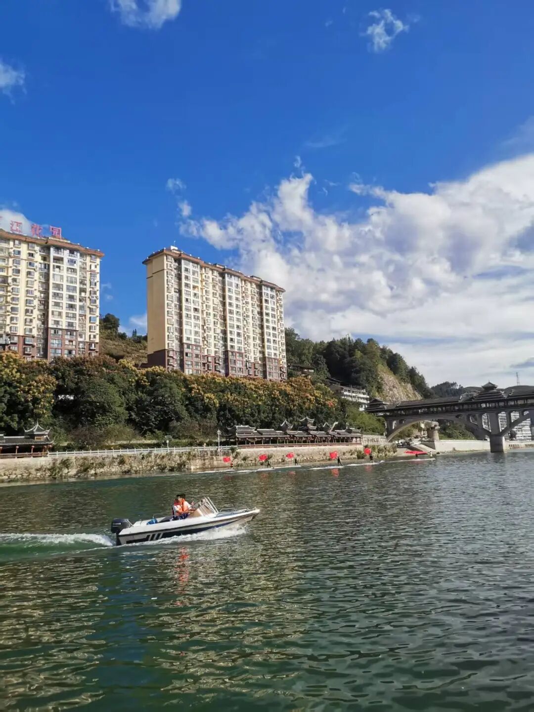国庆中秋“双节”期间,锦屏县每天下午至傍晚,在县城“三江国家水利风景区”清水江大桥至赤溪坪风雨桥水域,精彩的水上运动游演吸引了众多游客驻足观看,表演者在水面上做出各种高难度动作,水花四溅,惊险刺激,成为清水江上一道亮丽的风景线。