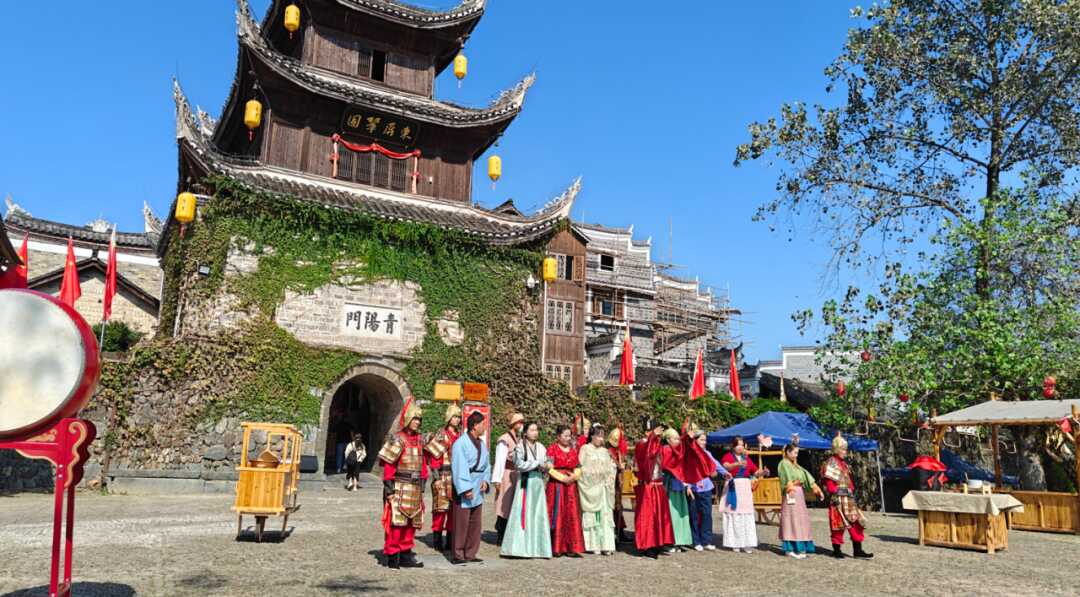 “龙舞庆双节・隆里嗨翻天”锦屏隆里古城花脸龙嘉年华暨国庆中秋系列活动,以活化“军屯文化”为核心,打造多维度沉浸式体验场景。游客们在城门迎客仪式中,随着身着明代服饰的“千户大人”宣布开城门,花脸龙队伍带领大家入城,仿佛“一秒穿越大明”,感受600年前的军屯生活烟火气。在龙标书院、千户所、隆里酒肆等区域,“穿越六百年”大型沉浸式剧本杀让游客化身不同角色,解锁各种剧情,开启专属的军屯生活盲盒。