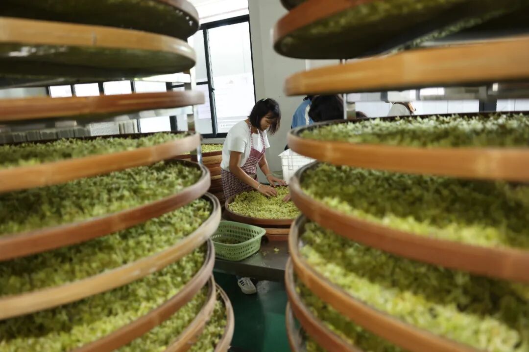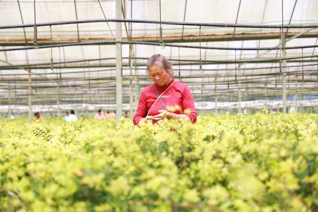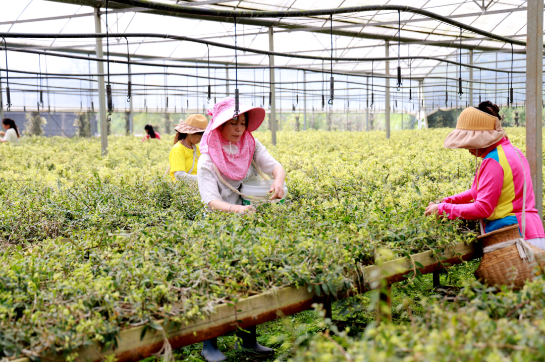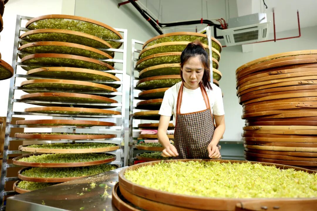 新鲜的石斛花一摘下,就被送到加工厂进行分拣、烘干、打包。“我们对石斛花的采摘有着严格的标准,这样才能精准地控制品质和延长采摘周期。”基地管理员龙立敏手托一串鹅黄色的石斛花介绍。得益于智能化温室大棚和标准化种植管理技术的应用,基地实现了花期可控、品质更优,为精深加工提供了稳定优质的原料。