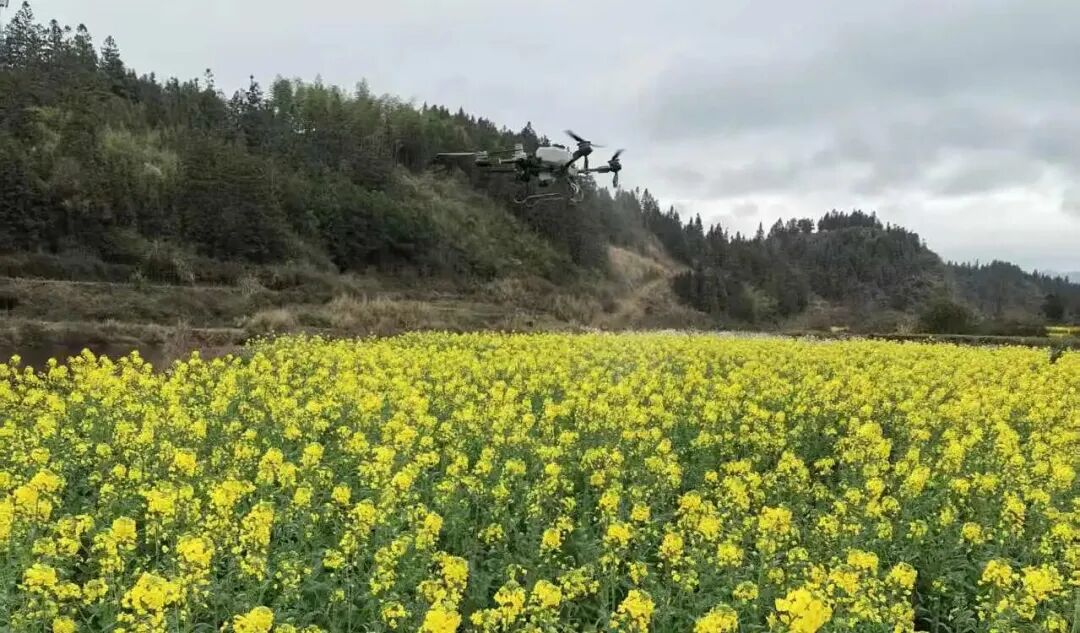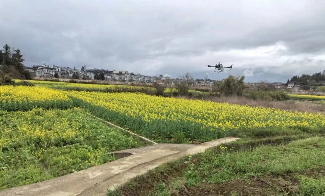 据了解,新化所村今年共种植油菜1200亩,主要分布在东门田坝、北门田坝、南门田坝及南边田坝四大片区,种植面积大、分布范围广,当前正值油菜生长的关键时期,也是病虫害防控的重要节点,面对传统人工防治效率低、成本高、穿透性不足等问题,村“两委”积极引入现代农业科技,协调专业农业服务组织,启用植保无人机进行飞防作业。