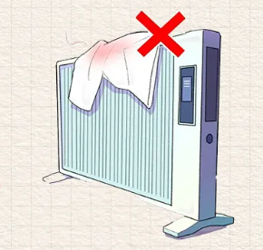 不要在电暖器上搁置衣服等物品,热量不能及时散发会造成烧机及引燃其他物品。