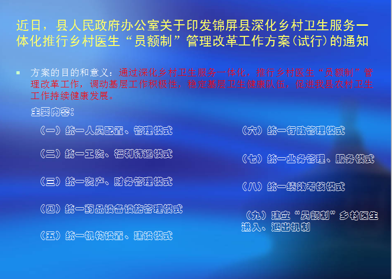 • 图解:锦屏县深化乡村卫生服务一体化推行乡村医生“员额制”管理改革工作方案(试行)