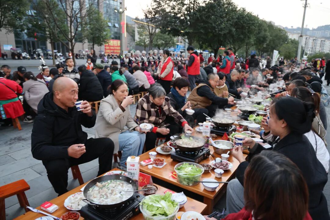 12月5日,2025年贵州省“村羽”系列羽毛球邀请赛各代表队顺利抵达锦屏县报到。为聚赛事人气、迎八方来客,当天下午5点,锦屏县在赛事球馆外的八角亭广场摆下特色庖汤长桌宴,来自全国各地的羽毛球爱好者、参赛选手及观众游客欢聚一堂,共品乡土美味,以浓郁民族风情与暖心待客之道,为这场体育盛宴注入别样温情与魅力。