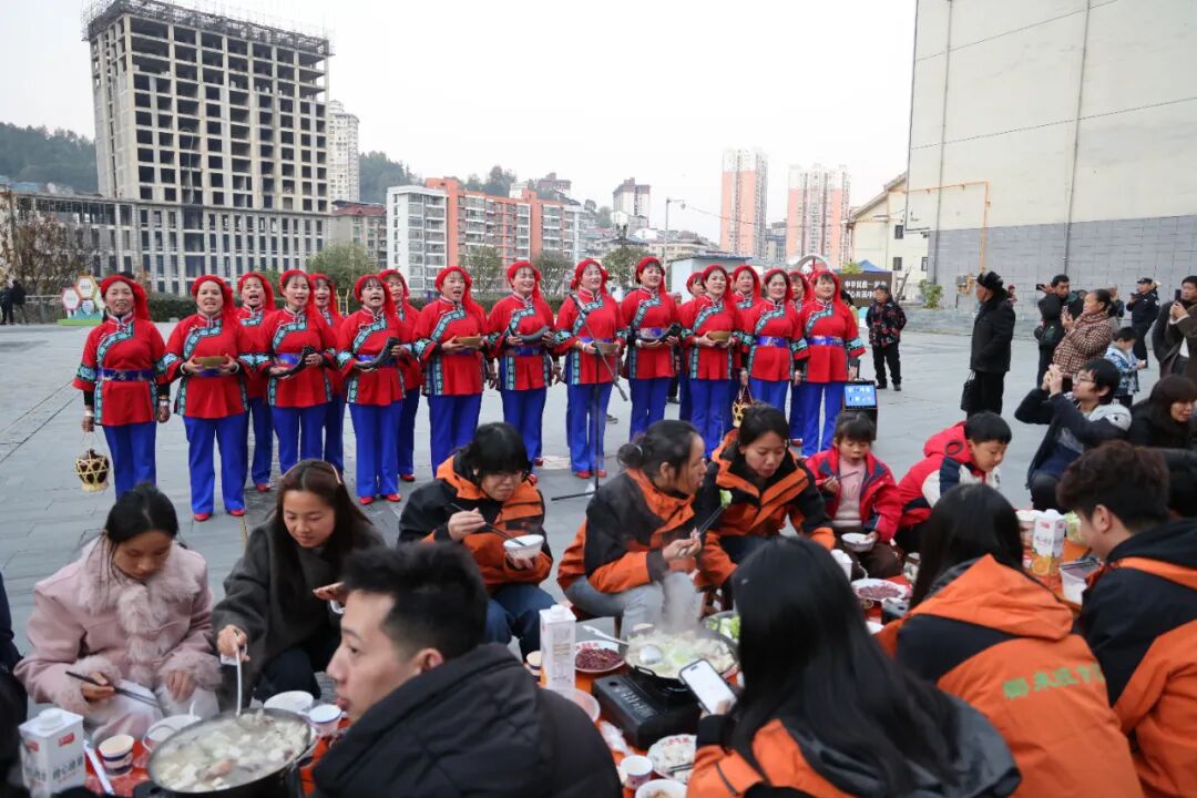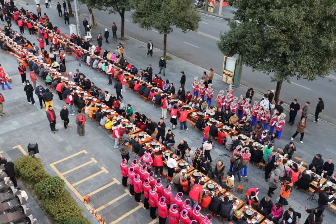 庖汤长桌宴现场香气馥郁、热闹非凡。数百名县内外宾客围坐百张餐桌,把酒言欢、畅谈情谊,鲜香醇厚的猪肉庖汤搭配多样地方特色菜品,此外还有锦屏侗族民歌传唱、非遗技艺展示、隆里花脸龙舞龙表演。烟火气与文化味交融,让大家在味蕾满足中感受乡土温情,沉浸式体验锦屏民俗文化的独特魅力,也为赛事增添了浓厚氛围,聚拢超高人气。