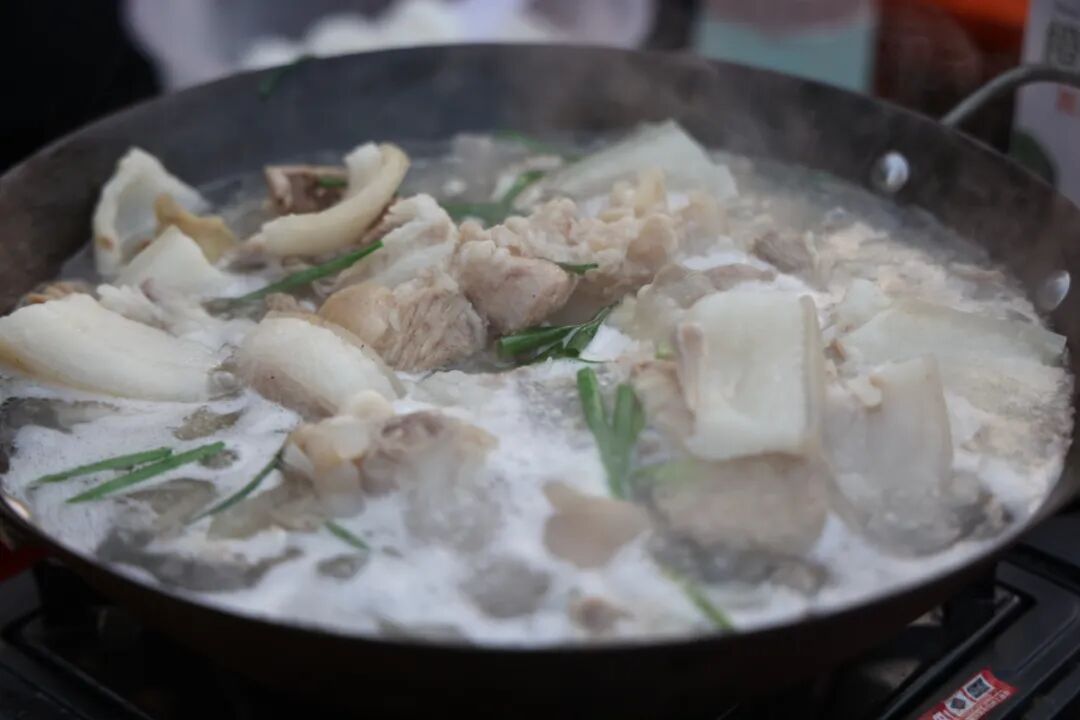 据悉,长桌宴的核心菜品庖汤,是锦屏地道乡土美味,更是正在参加“张家界七星山杯荒野求生挑战赛”决赛的锦屏籍选手吴高书心心念念的家乡味道。作为贵州农村宰杀年猪时的经典火锅主菜,庖汤以新鲜大块薄片猪肉、粉肠、血旺为主料,分清汤、辣味两种口味,口感鲜美醇厚、清甘不腻,营养丰富且余味悠长,历经岁月沉淀,成为极具地方风味的时令佳肴,深受大众喜爱。